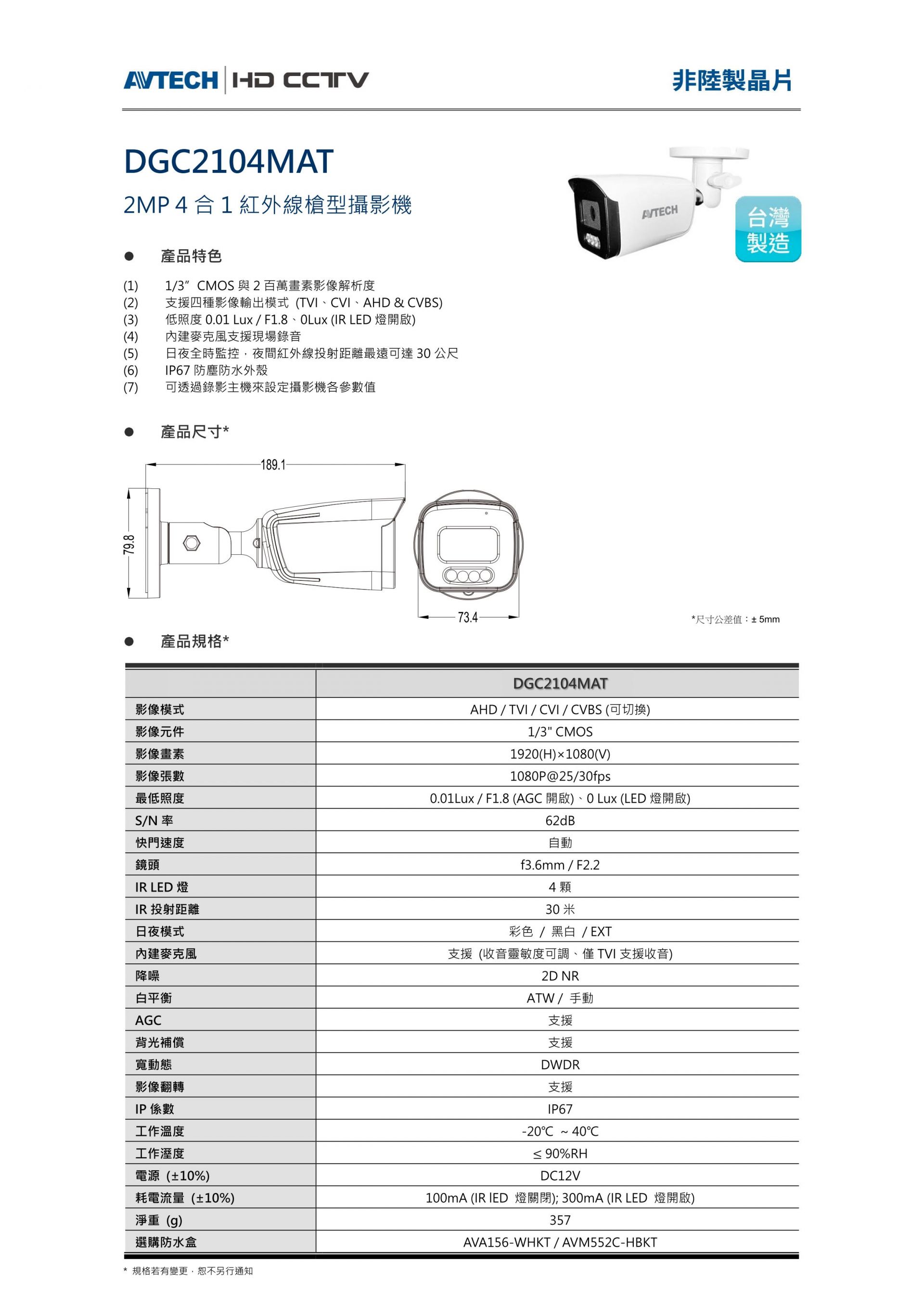 台灣製造 非陸晶片 DGC2104MAT 紅外線槍型攝影機