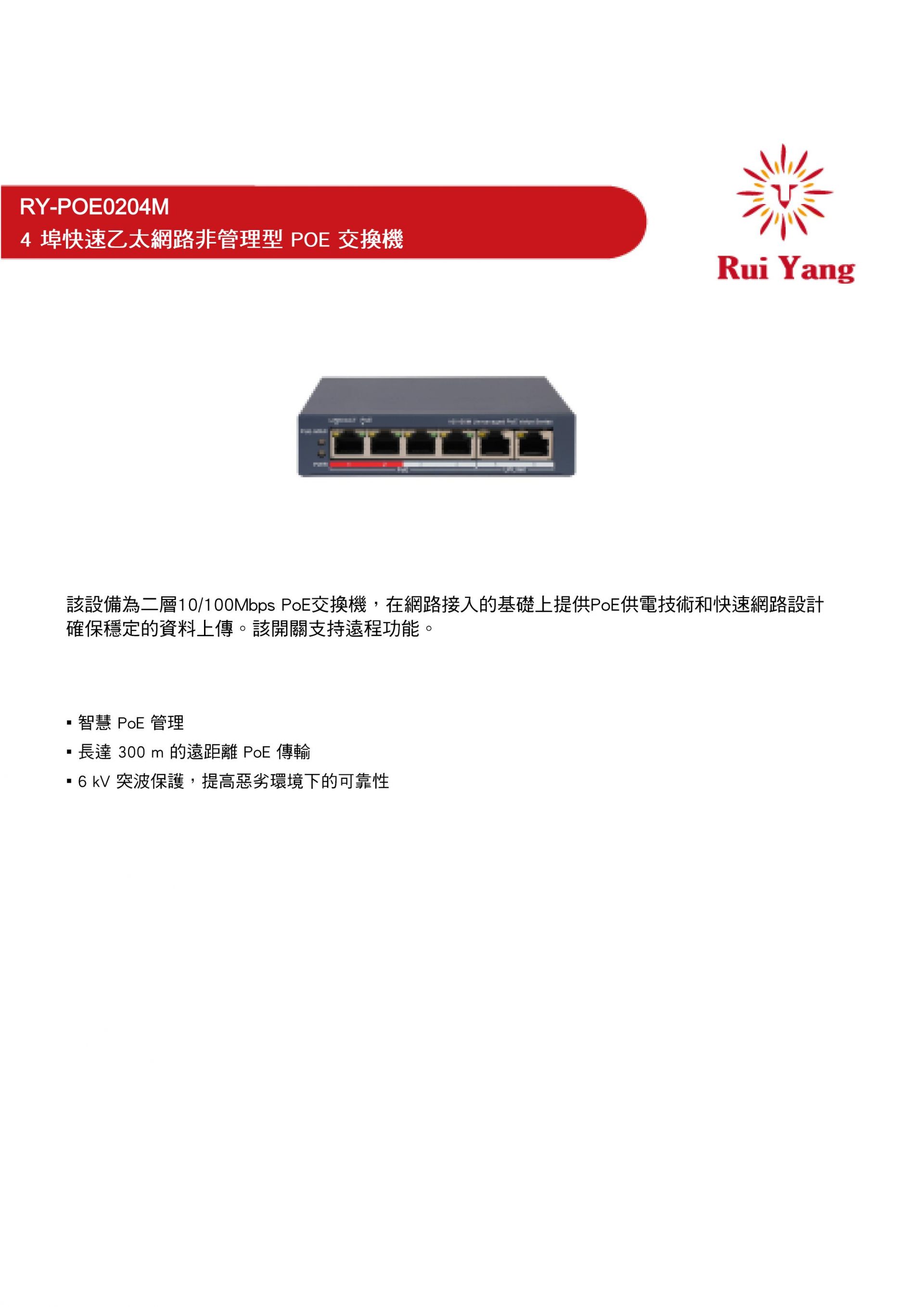 RY-POE0204M 4埠快速乙太網路非網管型POE交換器