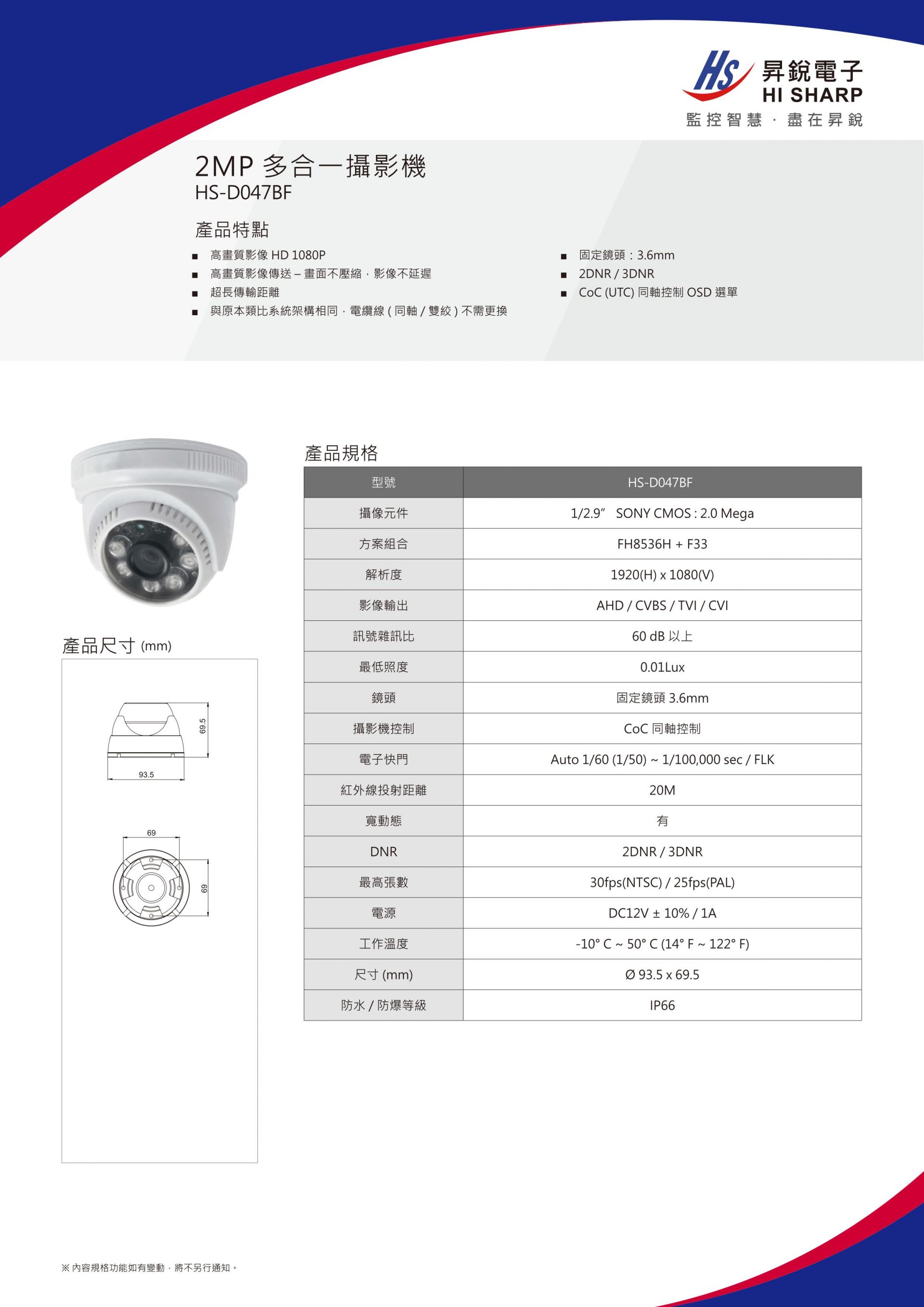 上一個 HS-T079BF 3.6/6mm 1080P紅外線槍型攝影機